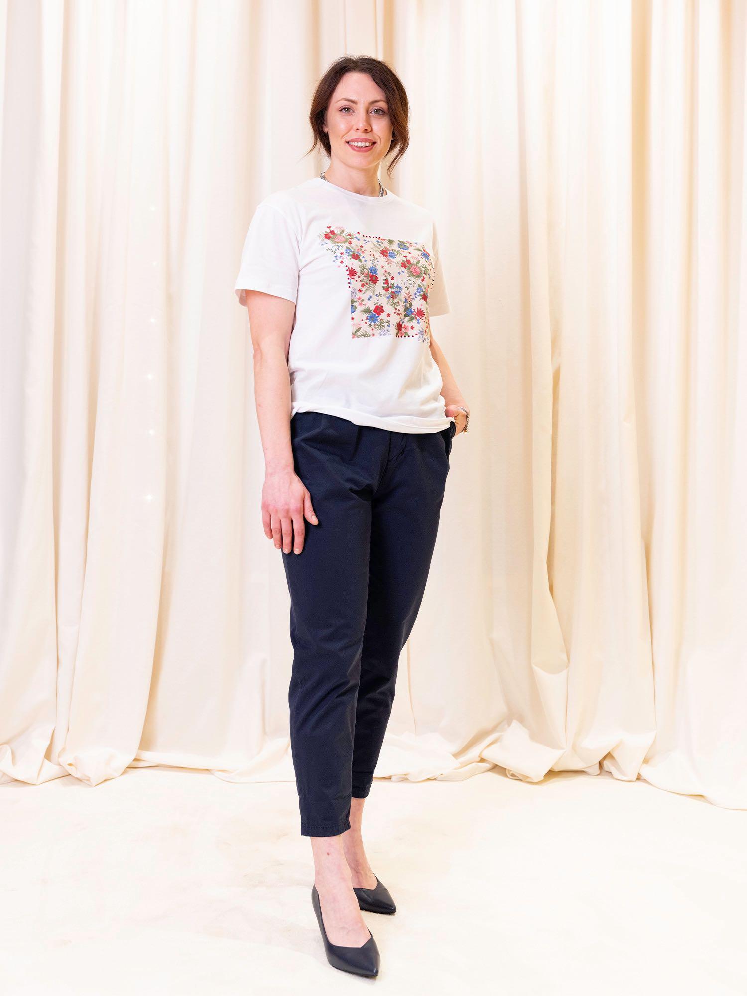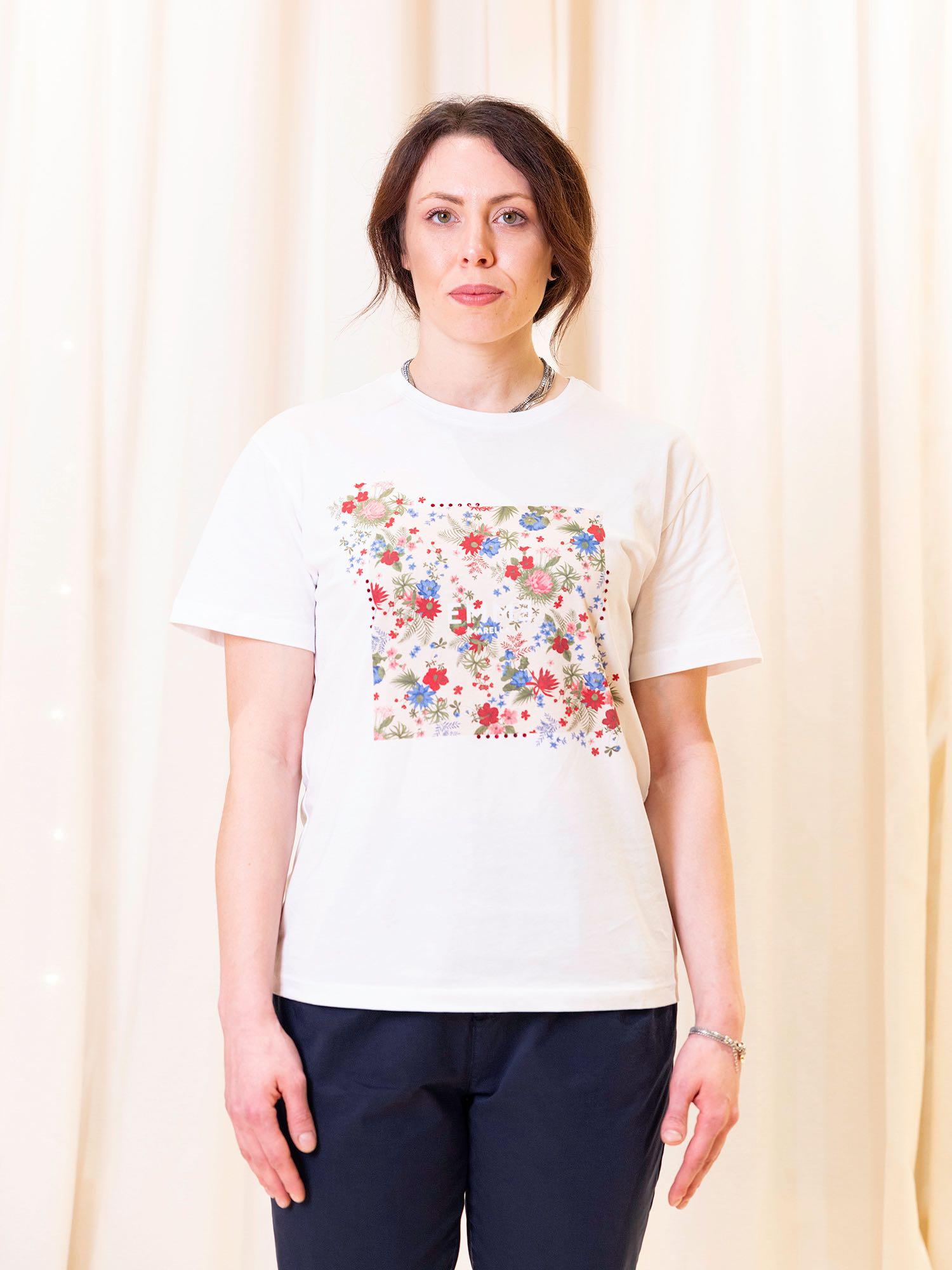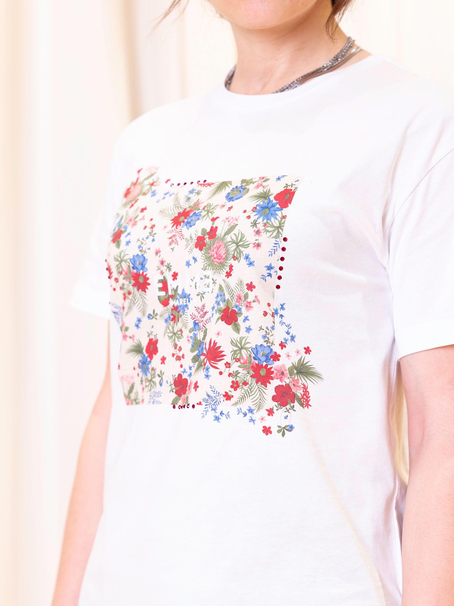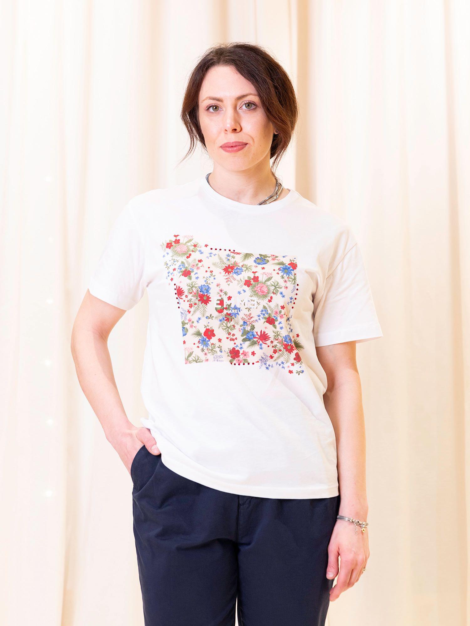 T Shirt jersey di puro cotone con stampa. Dritta, leggermente over, scollo stondato, spalla scesa con manica corta. Composizione: 100% cotone